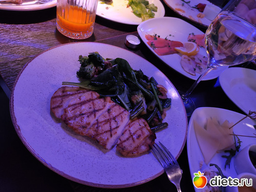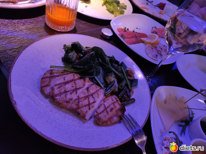 Позавчера были приглашены в рестик) ну так вот я конечно поела того чего не надо было. Началось всё хорошо, заказала салат с много зеленью, и курочку с овощами( шпинат, кабачок и шампиньон). НО всегда есть НО