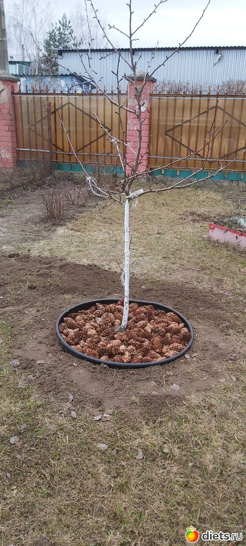 листву. Под молодыми грушами сделала круг, и шишки пригодились из под сливы, об этом я писала раньше.