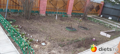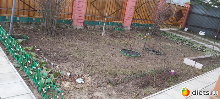 Добрый вечер! Хоть сегодня праздник, но я решила поработать на даче. Дела же всё равно делать надо. А то потом будет опять длинная неделя-5 рабочих дней. После работы не особо, что поделаешь. Так как у нас ночевал внук, с утра он опять заказал блинчики. Испекла блинчики, так у меня ещё и варёная сгущёнка была. Его за уши не оттянешь. Потом сварила рыбный супчик. А с утра ещё рассадой немножко позанималась, пока мои спали. Маленькие цветочки распикировала по отдельным горшочкам. Внук с мужем проснулись в 9. Мы дружно позавтракали, и каждый начал заниматься своими делами. Внук на велосипеде поехал к подружке. Чем муж занимался, я не знаю, потому что я была на участке. Сначала обработала все кусты медным купоросом и ещё какую-то гадость туда добавила, а то смотрю, уже почки начинают набухать. Потом доделала клумбу с гортензиями. Тоже обромила их кругами. Пока накрыла материалом подумаю, что насыпать можно сверху.
