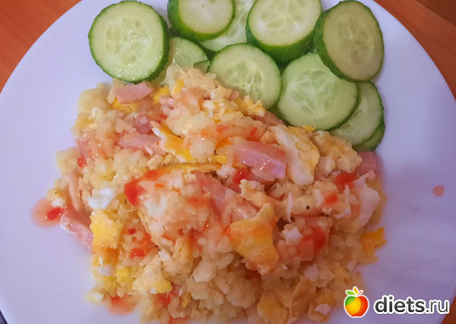 Завтрак постаралась сделать более сытным потом что понимала что поем нормально только после учебы. Итак на завтрак 2 яйца, пережарила с рисом, туда же немного ветчины и огурчик, и немного соуса, и зефирка с чаем.