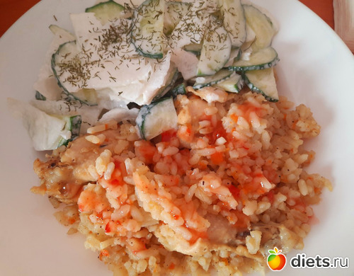 На обед - плов с курицей и салат из огурца и дайкона со сметаной