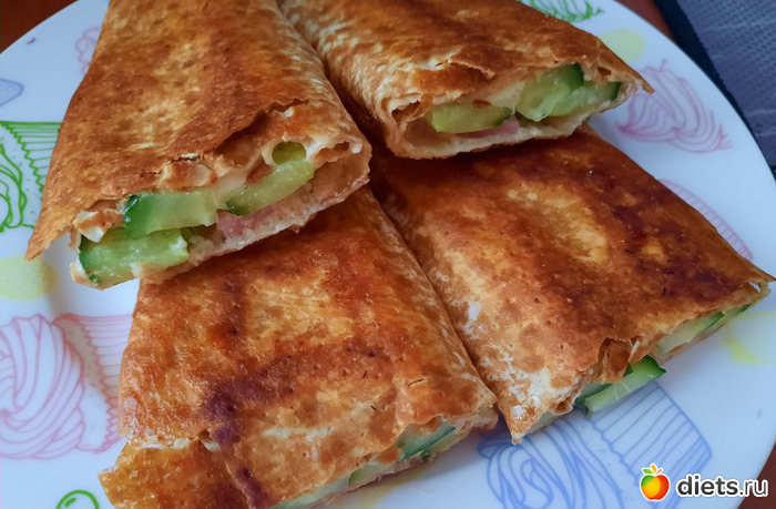 На ужин лепешки с начинкой из ветчины, огурца и сыра и сделала типа соус (сметана + кетчуп + чеснок), и чай.