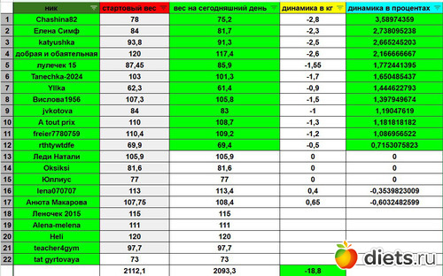 В таблице происходят изменения, все больше и больше участников показывают свои цифры! Неизменным остается только ваше желание добиться желаемого веса ) А где желание там и результат! Шаг за шагом к своей цели!