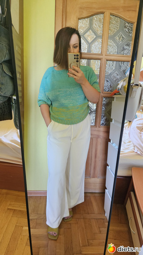 Очень понравились брючки на тебе и ажурная белая кофточка (под вязанную).