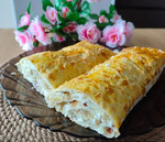 Свернуть в плотный рулет. Уложить на застеленный пергаментом противень, смазать желтком.