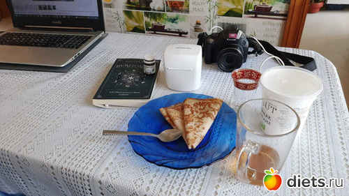 * позавтракала (заливная курочка, чёрный хлеб 1,5к, пару долек апельсина, ща буду пить чай с блином)