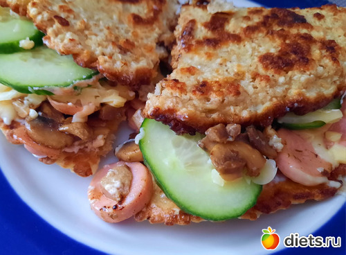 Сижу завтракаю и заодно пишу пост. На завтрак сегодня овсяноблин с шампиньонами, сосиска из телятины, немного сыра, огурец, сметана и чуток кетчупа.