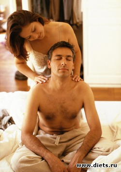 На это время тело можно прикрыть полотенцем, а под голову подложить небольшую подушечку. Лицо нежно поглаживаем кончиками пальцев или с помощью пушистой кисточки: от середины лба к вискам и от скул к подбородку. Особенно благодарен мужчина будет тебе за массаж затылочной части и шеи.