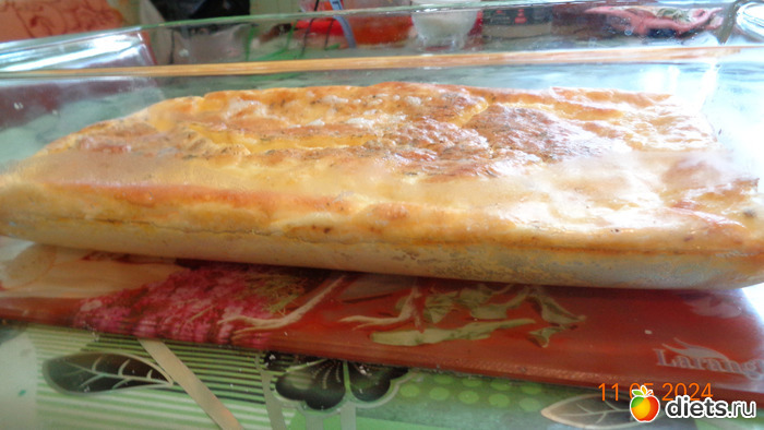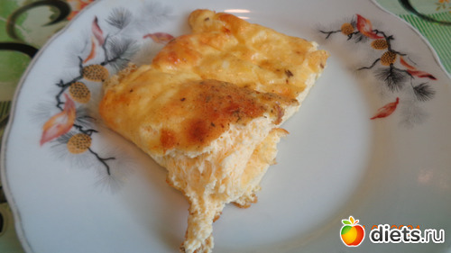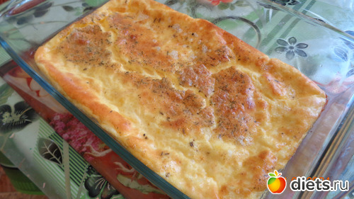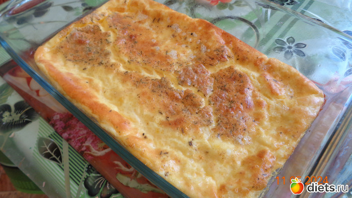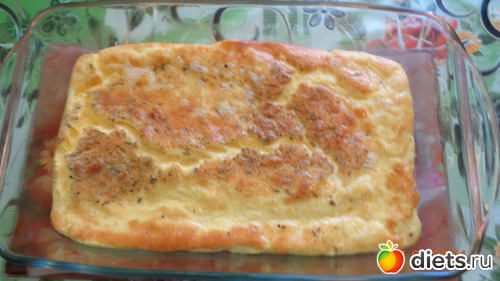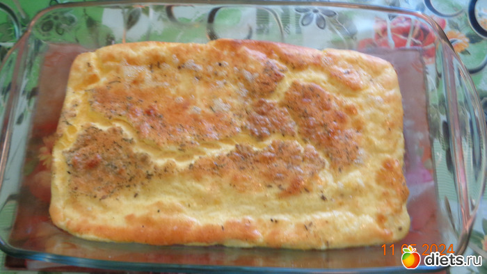 5. Перелить полученную яично-молочную смесь в форму. Форму заполнять не более, чем на 2/3, так как омлет поднимется. И поставить в предварительно разогретую до 200 градусов духовку на 30 минут. Первые 15-20 минут духовку не открывать.