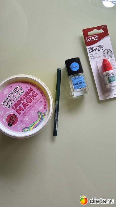 В косметическом скромно: скраб, зеленый карандаш Essence, укрепитель для ногтей Catrice, дочке клей для накладных ногтей