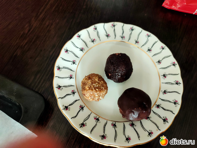Муж сегодня пришел с работы, пробовал конфеты. Миндальные он назвал трюфелями из дорогого шоколада, с черносливом ему больше понравились - слаще, в кокосовых распробовал корицу (которой там нет