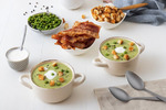Такой нежный крем-суп из курицы и гороха идеально сочетается с густой и жирной сметаной. Подавать его советую с сухариками и поджаренным беконом. Не забудьте посыпать его свежемолотым перцем и другими специями по вкусу.