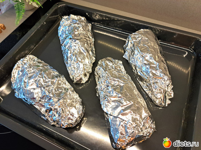 9. Завернуть каждую рыбину в фольгу (2 слоя), положить на противень и запекать в духовке при 185 градусах 30-35 минут.