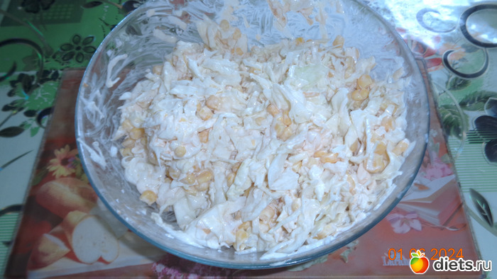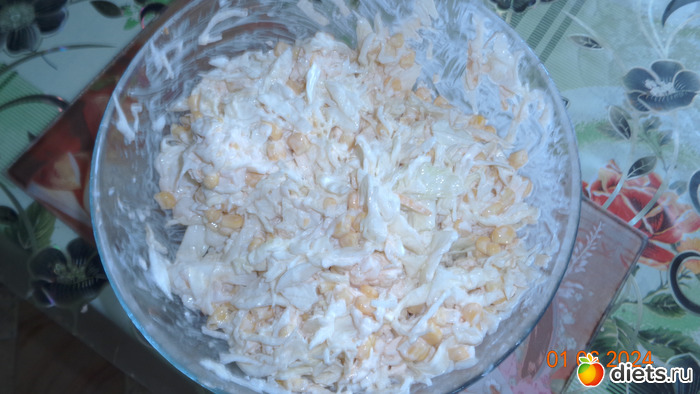 Сочный, нежный, хрустящий, витаминный салат из молодой капусты с кукурузой и плавленым сыром. Салат очень вкусный, элементарный в приготовлении. Молодая капуста обеспечивает сочность, плавленый сыр придаёт вкусу нежность, а консервированная кукуруза – нотки сладости.