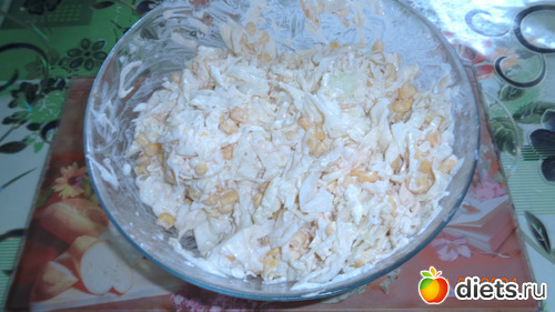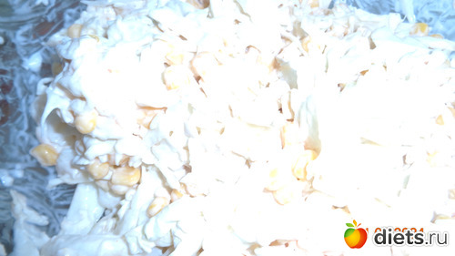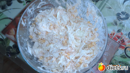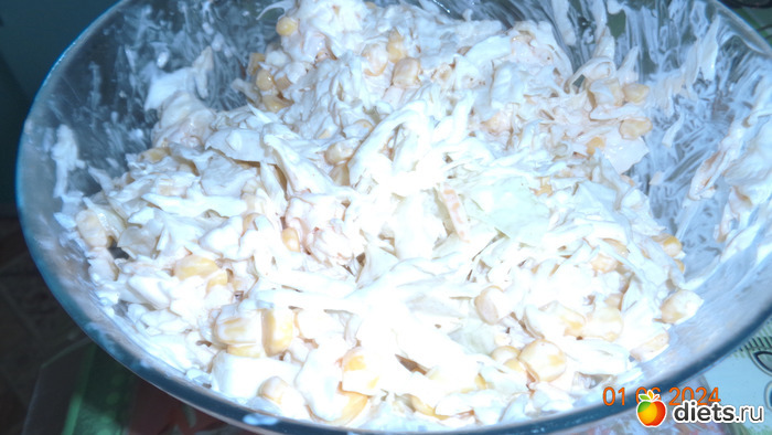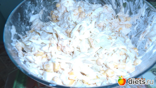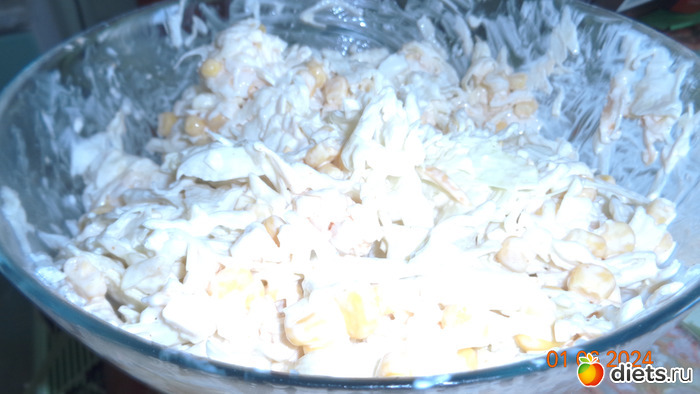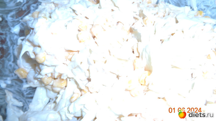 6. По вкусу подсолите и поперчите. Заправьте салат майонезом и хорошо перемешайте.