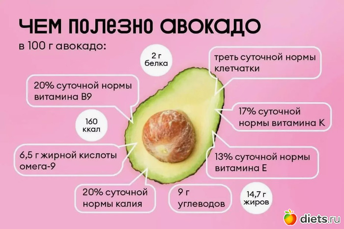 В авокадо много полезных пищевых веществ. Оно богато питательными веществами: здоровыми полезными жирами, пищевыми волокнами, витаминами и минералами. Авокадо приносит пользу для репродуктивной системы женщиАвокадо - очень сытный продукт.