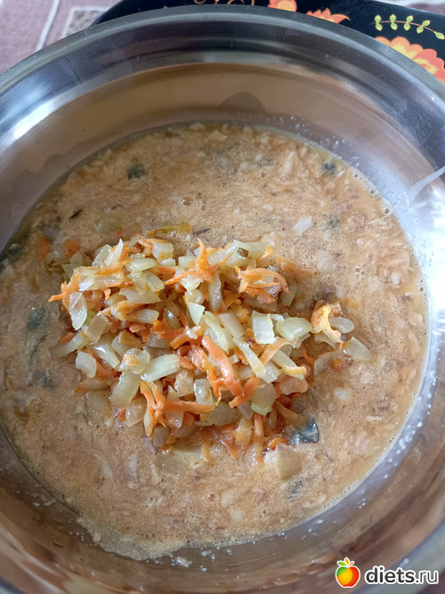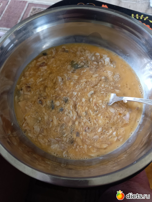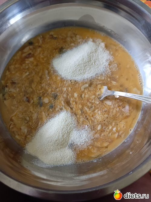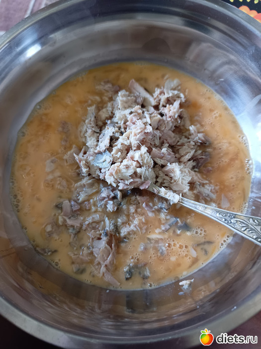 Из банки консервированной рыбы слить всю жидкость. Размять кусочки рыбы на мелкие кусочки. Обжарить до мягкости лук и морковь. Яйца размешать просто вилкой до однородности. В яйца добавить манку, лук с морковкой., рыбу кусочками, соль, приправы, зелень-по желанию.