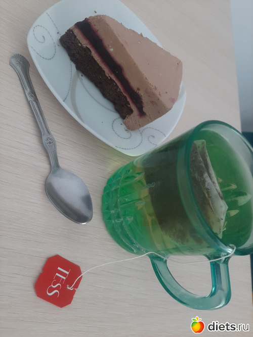 Ланч: тортик домашний шоколадный с черной смородиной (114 гр) и зеленый чай без сахара.