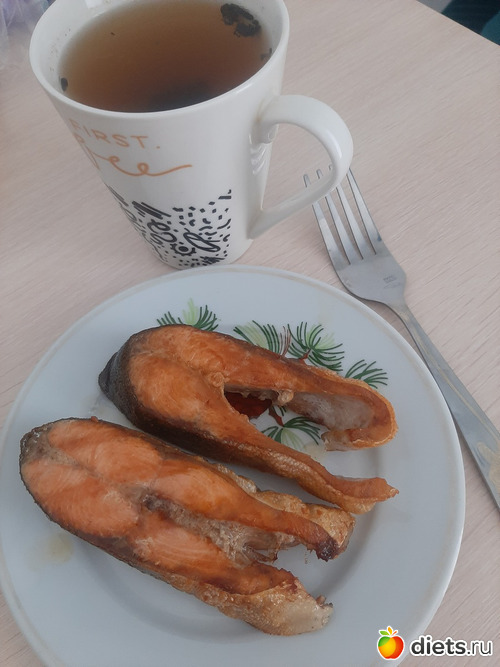 Завтрак: горбуша на сковороде-гриль (108 гр), булочка (59 гр) и зеленый чай без сахара.