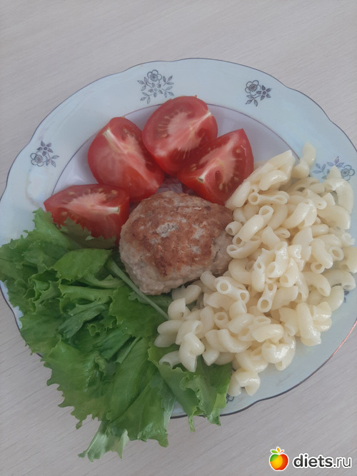 Обед: свиная котлета (91 гр), макароны отварные (95 гр), листовой салат (10 гр), помидор (111 гр) и зеленый чай без сахара.