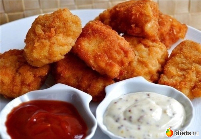 4. Жарим во фритюре небольшими порциями. После обжаривания кладем наггетсы на бумажные полотенца, чтобы впитать лишний жир.
