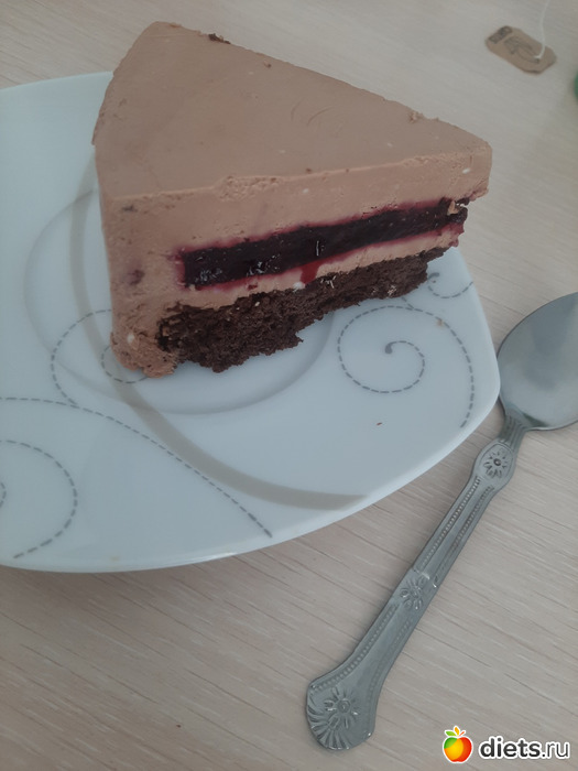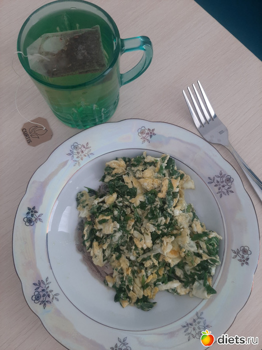 Завтрак: банан (150 гр) (после сдачи анализов крови), яичница со шпинатом (155 гр), тортик муссовый с черной смородиной (110 гр) и зеленый чай без сахара.