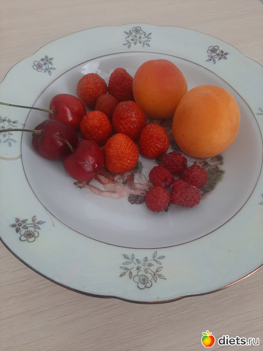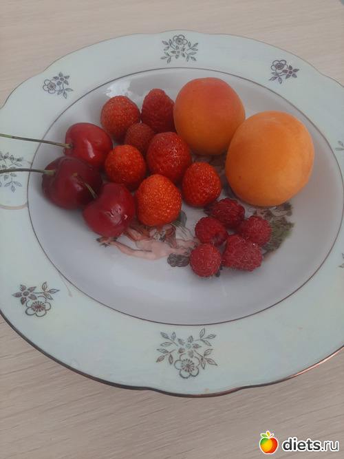 Ланч: абрикосы (81 гр), малина (11 гр), клубника (50 гр) и черешня (33 гр).