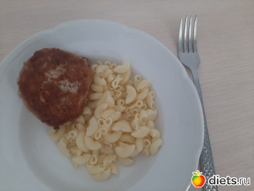 Обед: макароны отварные (53 гр), котлета свиная (90 гр) и вода.