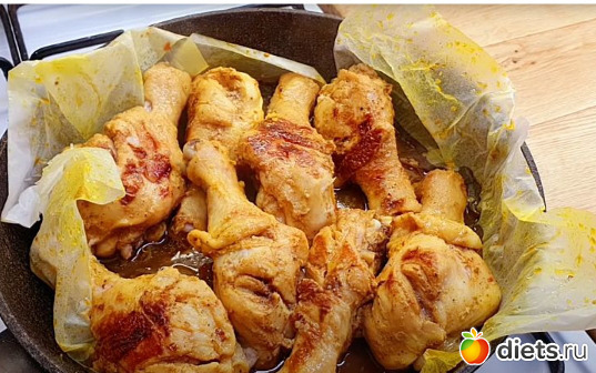 5. Через 5 минут аккуратно переверните куриные ножки на другую сторону. Снова накройте курицу пергаментной бумагой. Уменьшите огонь до слабого. Готовьте ещё 25 минут, накрыв крышкой.
