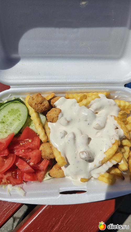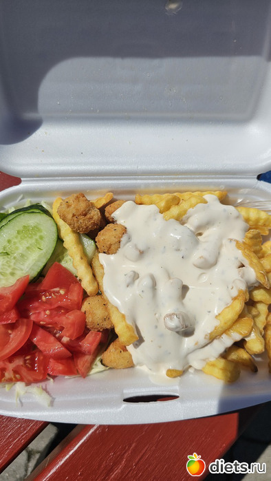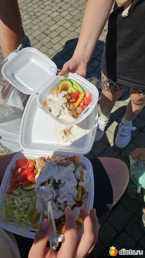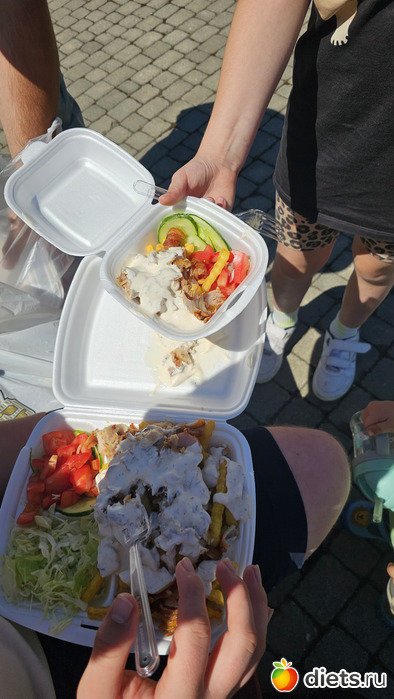 Сын выгуглил по дороге, что там есть фастфудная закусочная. Обед на вынос (малышку - из магазина готовое)