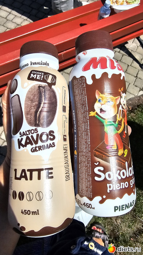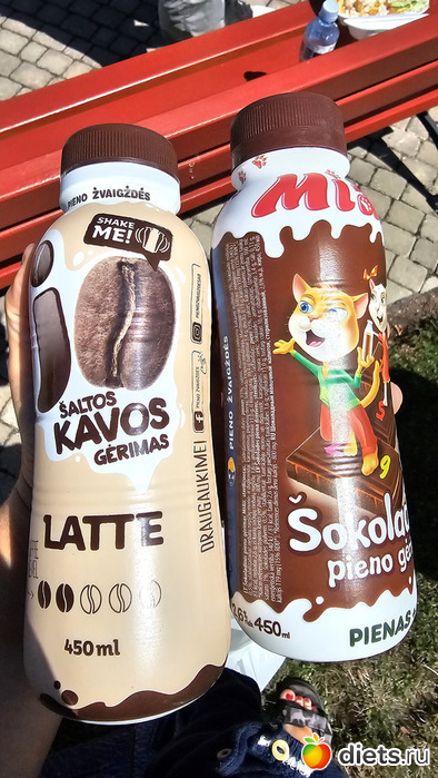 Этот литовский холодный латте очень вкусный, но очень калорийный, в порции ок 250 ккал. Справа дочке шоколадное молоко