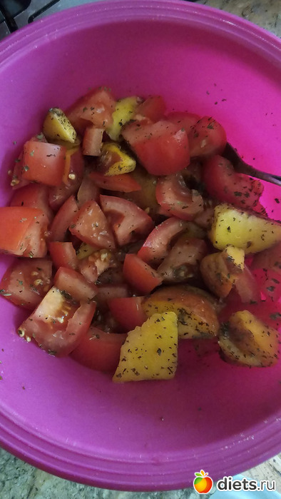 Салат помидор - персик - мята. Я не любитель салатов, но этот в сезон персиков ем