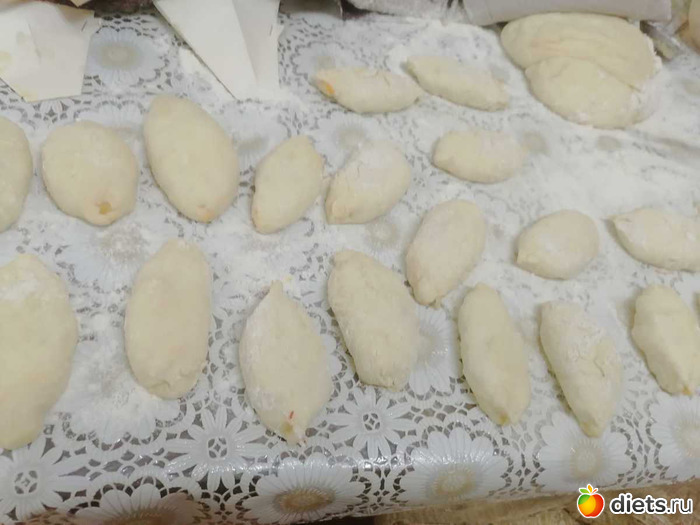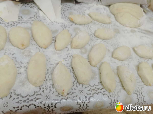 Берем один колобок, скалкой раскатываем овал. Кладем начинку, формируем пирожки.