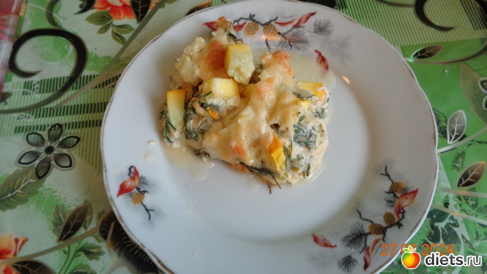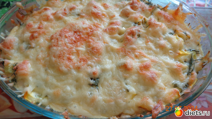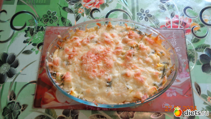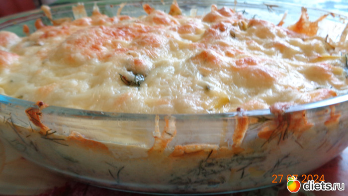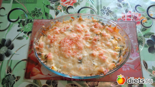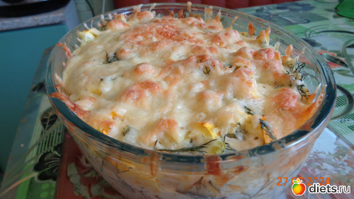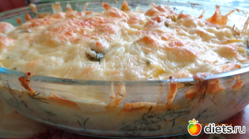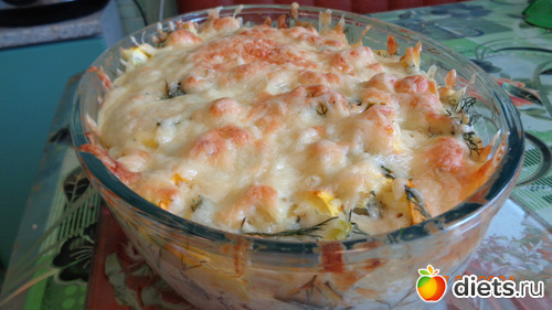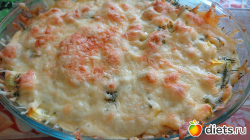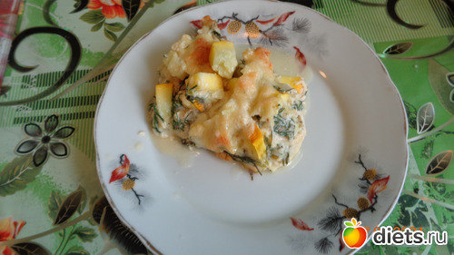 5. В сухую форму распределяем ровным слоем кабачки. Сверху поливаем кабачки готовым соусом.