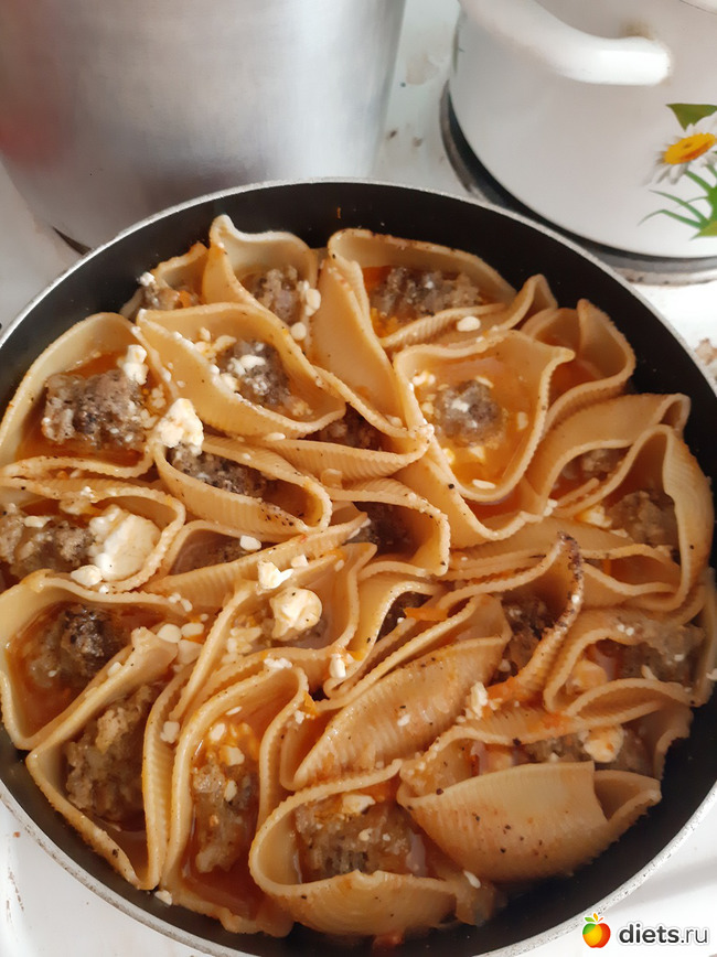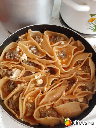 Заливка: майонез (на глаз, кто как любит) размешала с водой, залила так, чтобы ракушки были практически прикрыты.