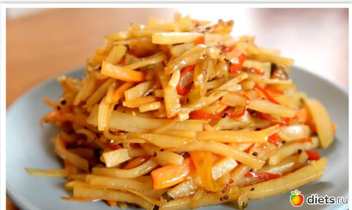Этот слегка острый картофельный салат с морковью и перцем отлично подойдет как в горячем, так и в холодном виде. Он станет интересным и оригинальным гарниром к более сложным блюдам.