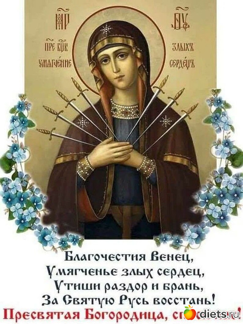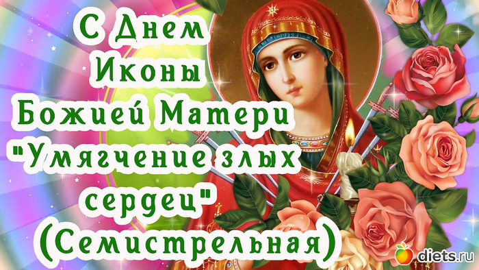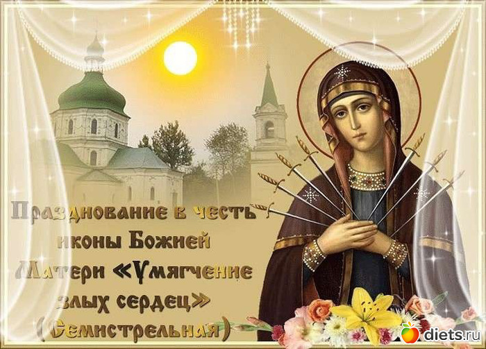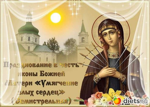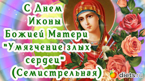 Поздравляю вас с Днём Семистрельной иконы Божией матери «Умягчение злых сердец»! Желаю, чтобы святой образ Богородицы хранил вас от бед, оберегал от зла. Желаю жить в мире, достатке и любви, с добрым сердцем и открытой душою. Крепкого здоровья вам и вашим родным. Душевного спокойствия и всех благ