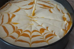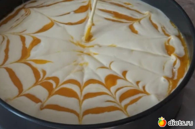 Выкладывайте по очереди по 1 ст.л творожной массы, затем 1 ст л тыквенной массы, тыквенное пюре по центру. 100 гр. тыквенного пюре оставьте для заливки. При помощи деревянной шпажки сделайте узоры.