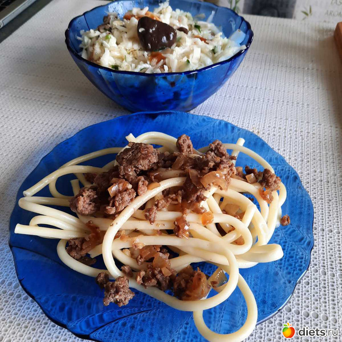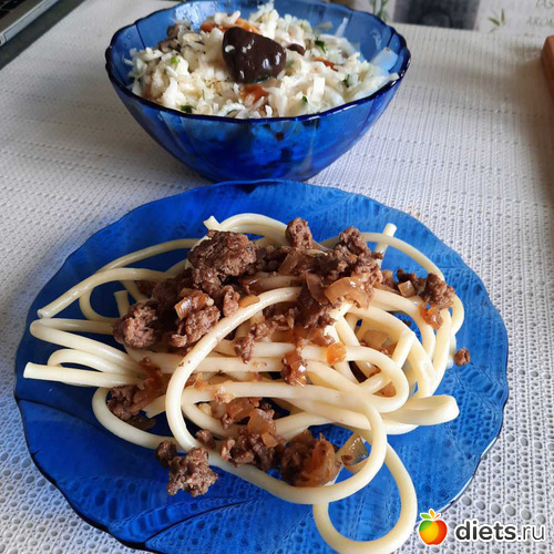 По сусекам ещё поскребла. Из сусек приготовила и горячее: спагетти из цз муки. нежирный говяжий фарш, припущенный с луком-чесноком.