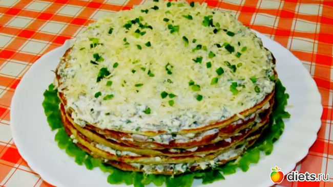 Формируем торт, смазывая каждый блин начинкой, прижимая блины друг к другу. Сверху натираем сыра и посыпаем рубленой зеленью. Отправляем в холодильник на 30 минут.