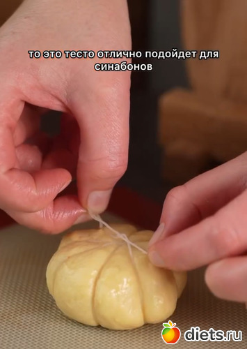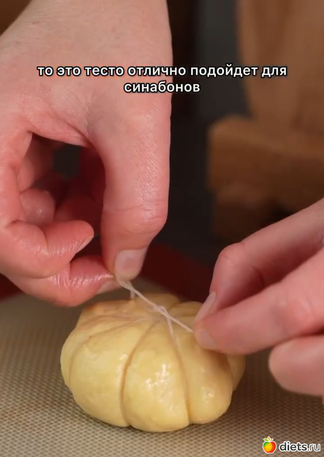 Подошедшее тесто обминаем и делим на 13 частей. Кусочек теста немного разминаем руками, как бы раскатывая. Выкладываем начинку, защипываем края и формируем колобок. Формируем тыковку с помощью кулинарной нити как на видео. Нить перед использованием промажьте маслом.
