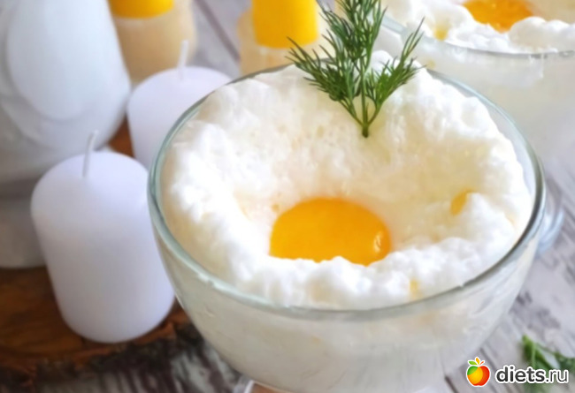 5. Выложить взбитые белки с сыром в формочки для запекания, которые подходят для микроволновой печи, и сделать в серединке небольшое углубление. В каждое углубление осторожно выложить по одному желтку, стараясь их не повредить.