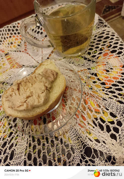 Это печень трески из Маркета, что я уже показывала. Я ела на бутерброде- на хлебе с чаем(размяла печень)
