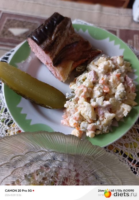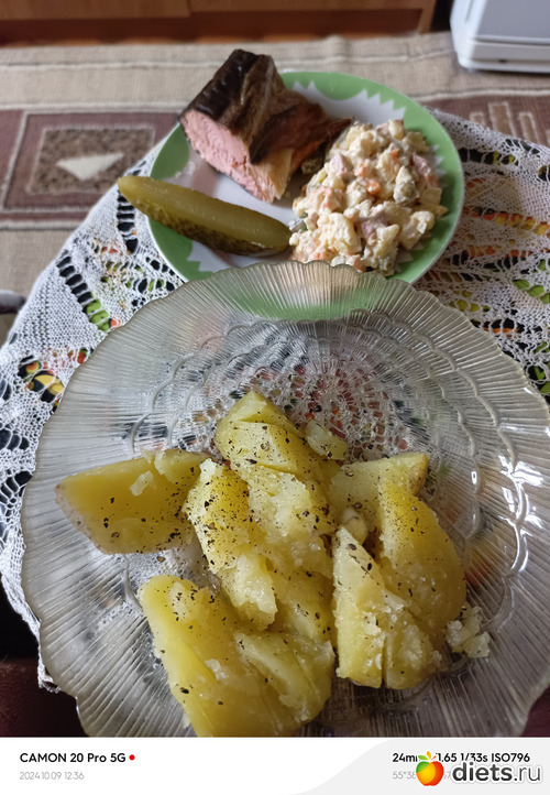 -Горбуша горячего копчения, салат доели и картофель отваренный-с ароматным маслом