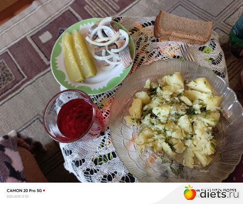 -Картошка, селёдка, соленый огурец, сок вишневый