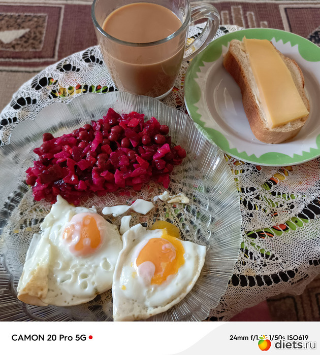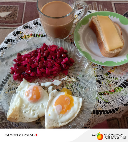 -Яичница, винегрет, кофе и бутерброд с сыром