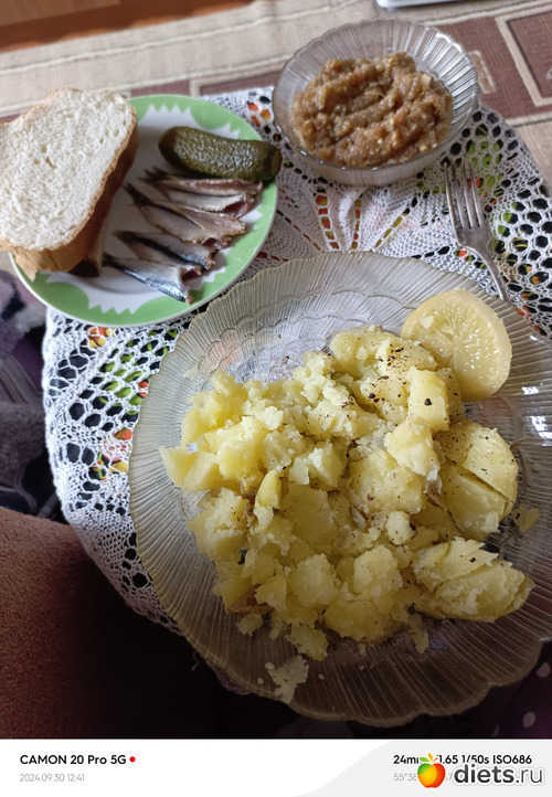 Захотели печень трески. Я захотела сельди в желе. Картошка в мундире, просто размятая-с маслом и с черным перцем