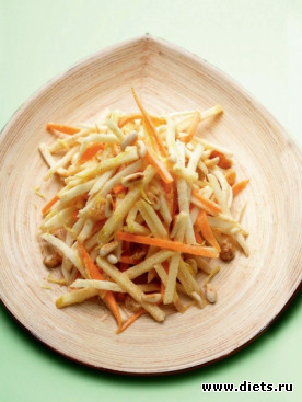 4 моркови 2 зеленых кислых яблока 200 г сельдерея 50 г кедровых орешков 50 г белого винограда 1 лимон 1 натуральный йогурт 2 ст. л. пасты миндального ореха соль, перец