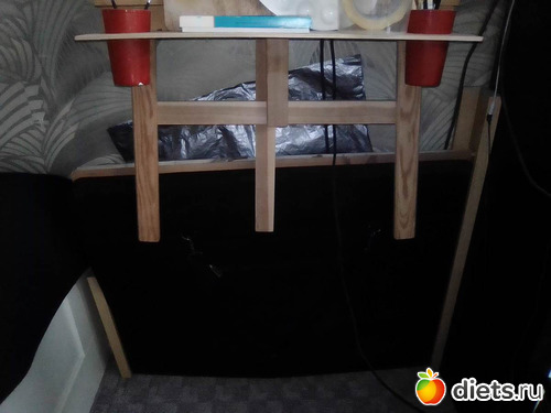 Из спортинвентаря в коробки не влезают коврики и скамейка для степ. Коврики храним свернутыми вертикально между шкафом и окном, там есть как раз место. Скамейка лежит на икеевском стеллаже, наверху.