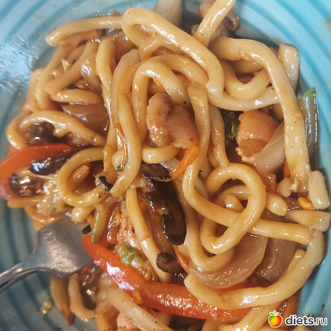 Лагманная лапша, куриное бедро, овощи, капуста кимчи, шиитаке,
